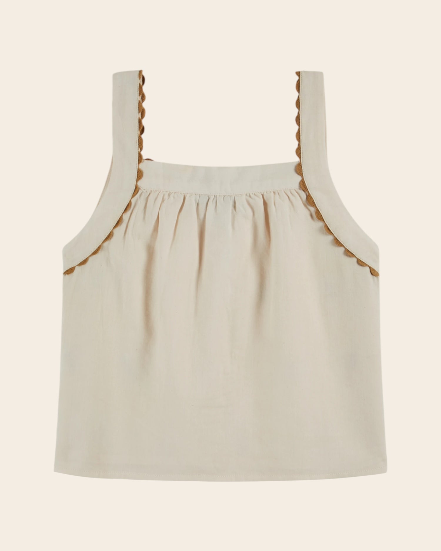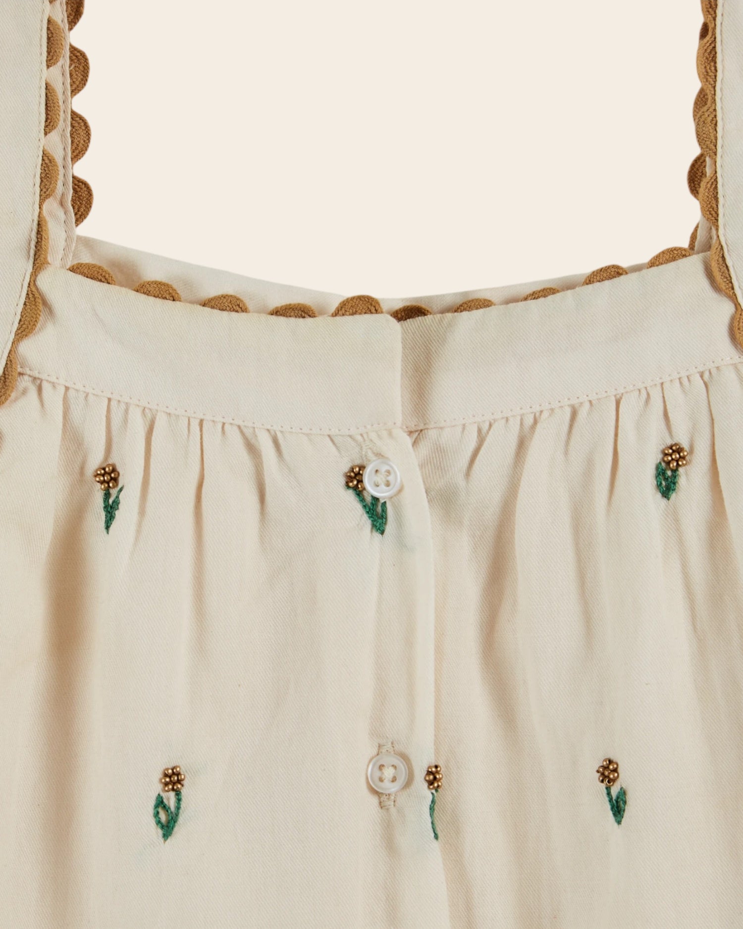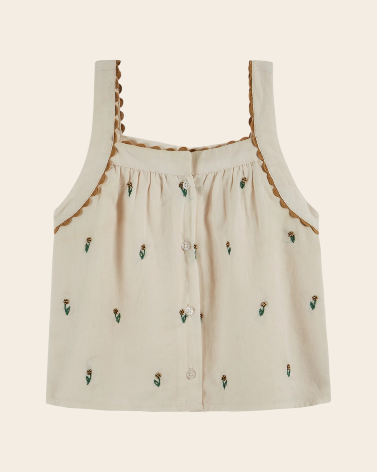 Top à bretelles en coton écru brodé de petites fleurs à perle sur le devant. Les bretelles épousent les emmanchures et sont finies par un galon festonné.