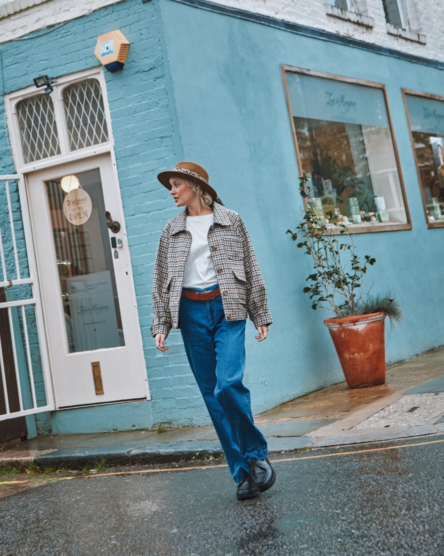Veste en laine mélangée à motif pied de coq grège, chocolat et bleu.