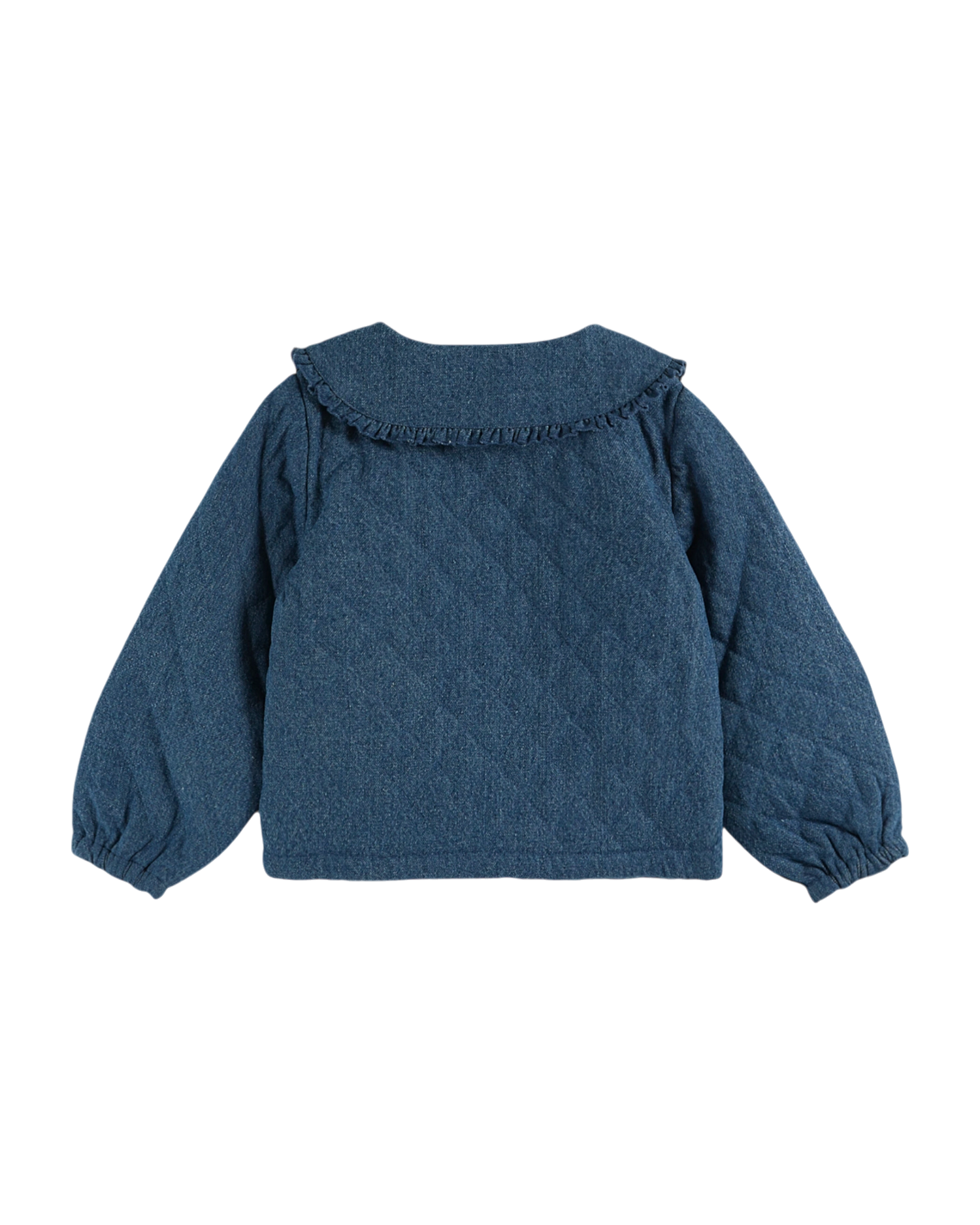 Veste matelassée en toile de coton denim bleu. Coupe droite, manches montées élastiquées aux poignets, fleurs brodées à la main sur le col plat rehaussé d'un froufrou froncé autour de l'encolure ras du cou et boutons en bois qui ferment la veste sur toute la hauteur. Deux poches dont le pourtour est orné d'un volant froncé se sont fait plaquer sur le devant. On y dissimule des bonbons, un mouchoir voire des mots doux.