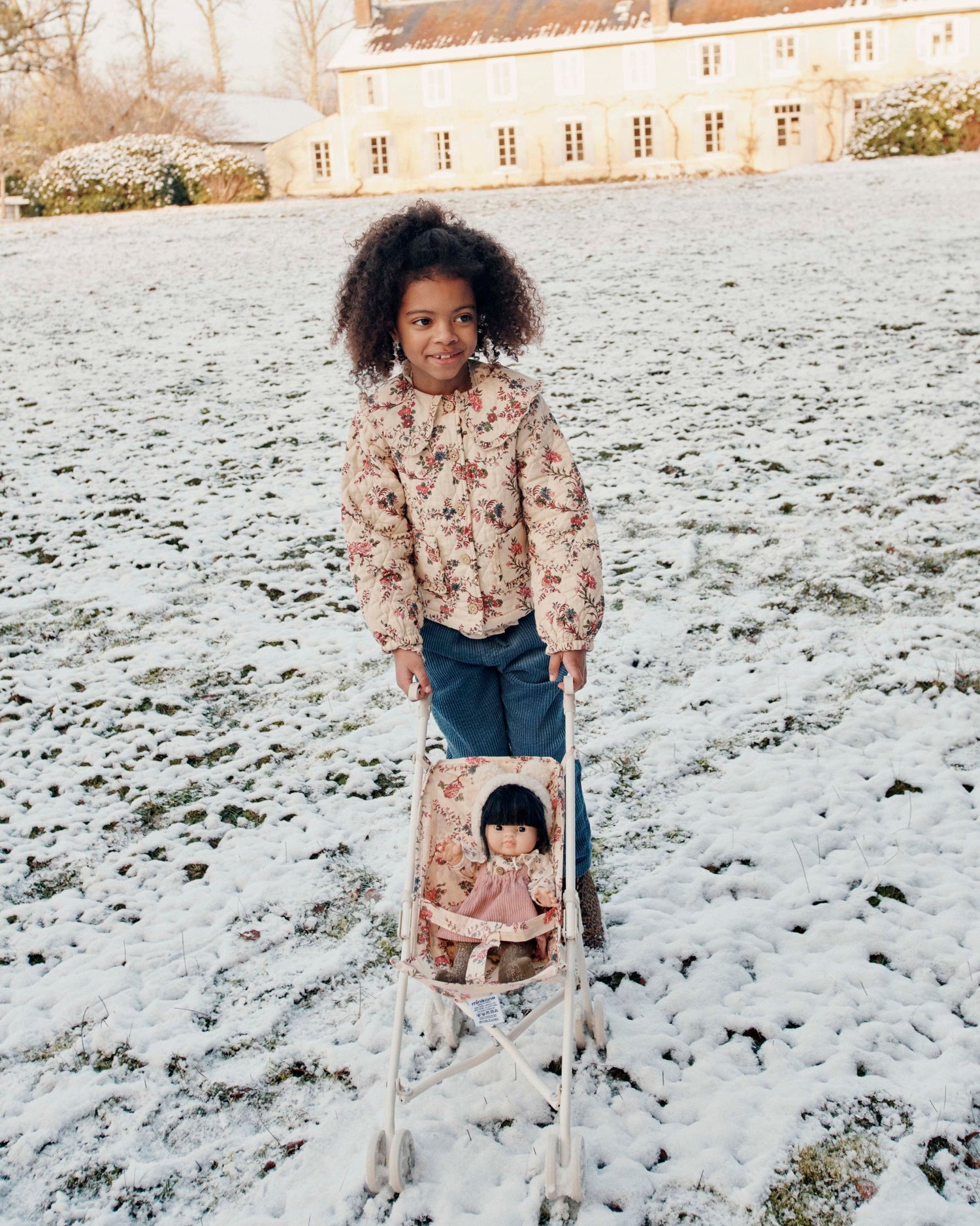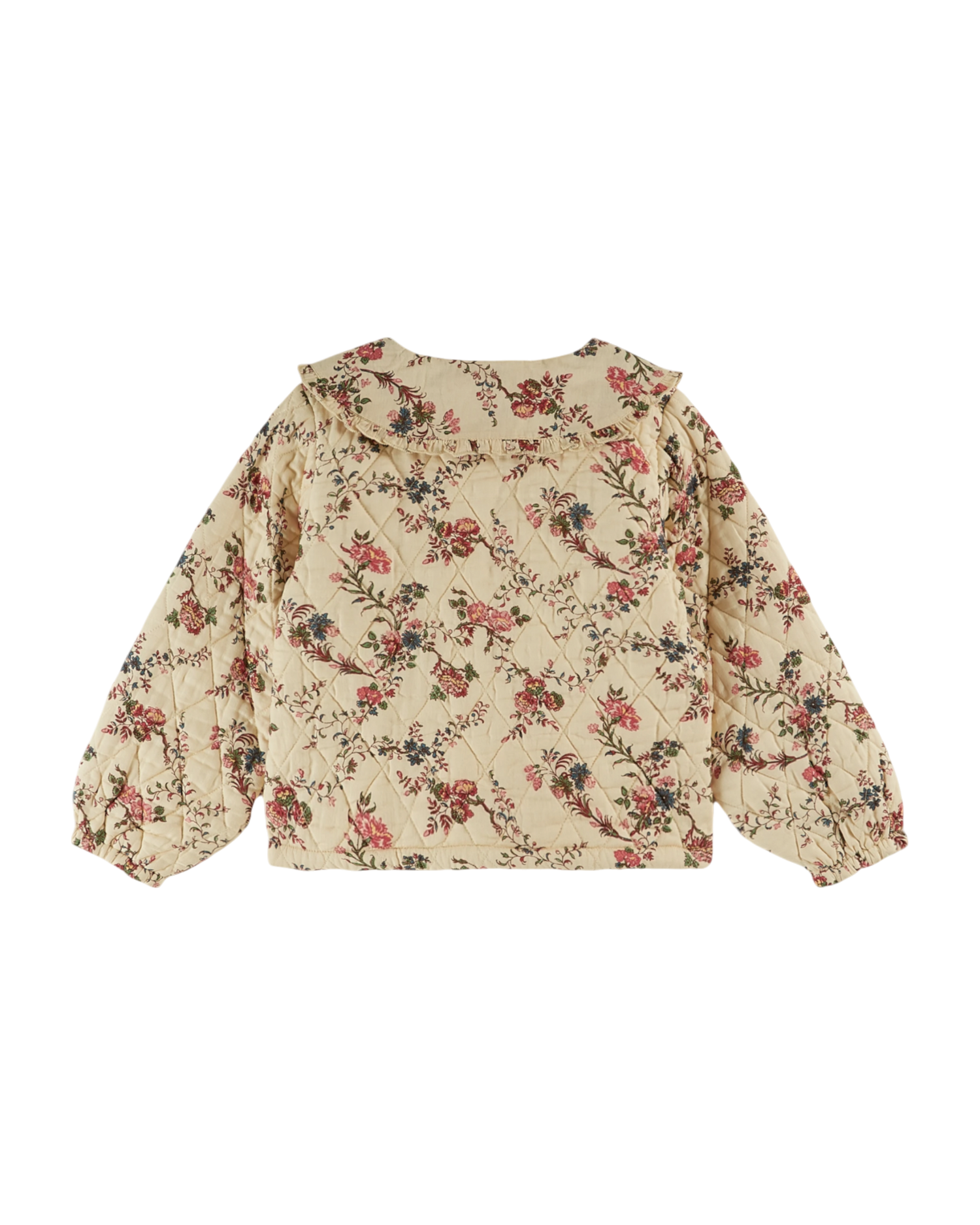 Veste matelassée en coton dont le fond beige est parsemé de rinceaux fleuris et feuillagés dans un camaïeu de rose et de vert. Coupe droite, manches montées élastiquées aux poignets, fleurs brodées à la main sur le col plat rehaussé d'un froufrou froncé autour de l'encolure ras du cou et boutons en bois qui ferment la veste sur toute la hauteur. Deux poches dont le pourtour est orné d'un volant froncé se sont fait plaquer sur le devant. On y dissimule des bonbons, un mouchoir voire des mots doux.