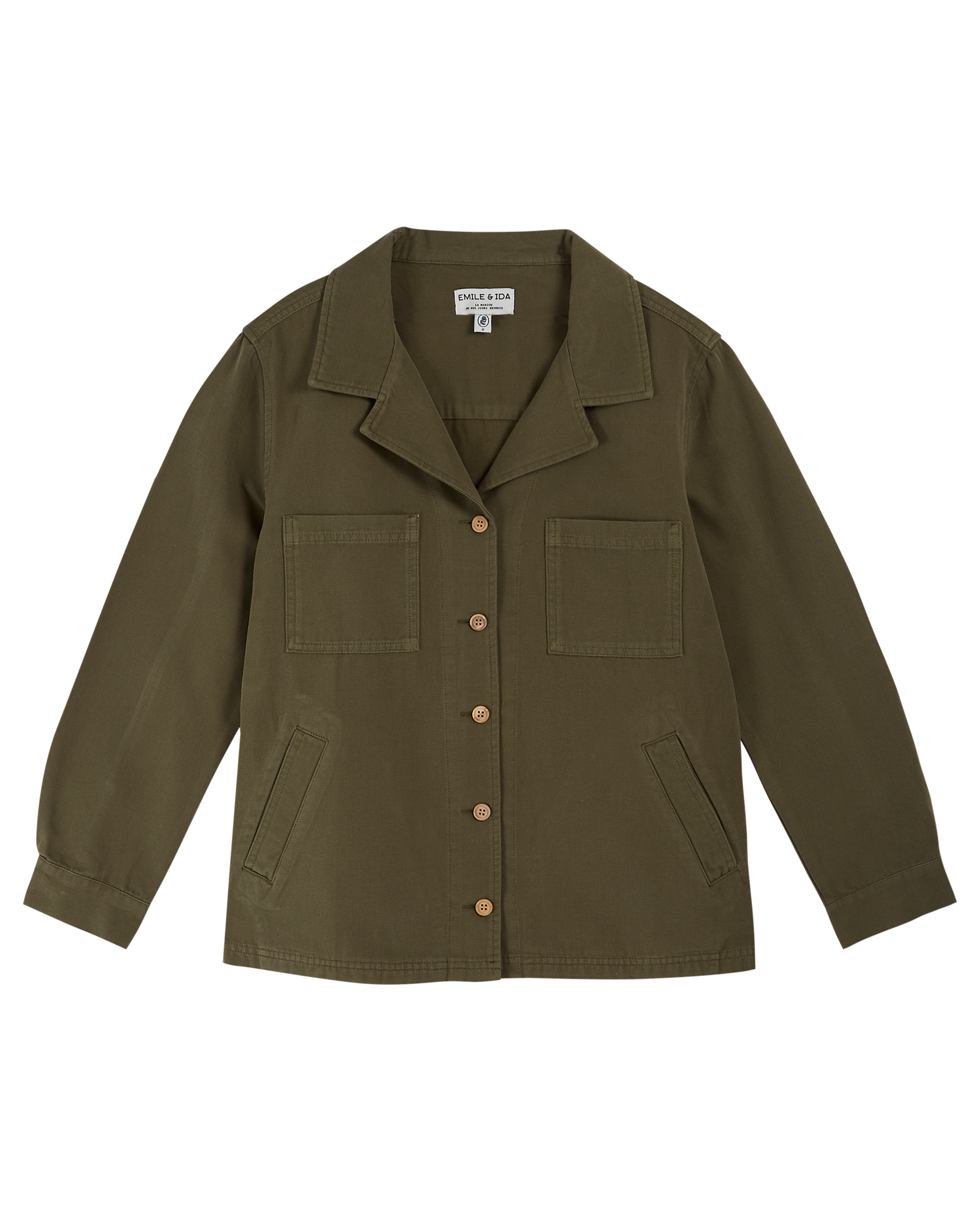 Veste en toile de coton vert kaki. On aime la matière, les deux poches plaquées sur la poitrine et les deux autres raglan, le col et les manches tailleur avec des poignets boutonnés. On apprécie aussi l'empiècement du dos, les fentes sur les côtés, les boutons en bois et les toutes les coutures surpiquées. Légère, petite, jolie ou bonne brise, il est temps de sortir sa veste !